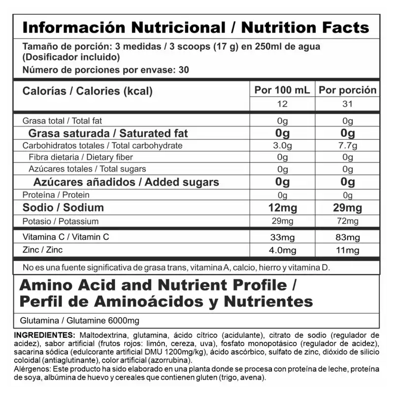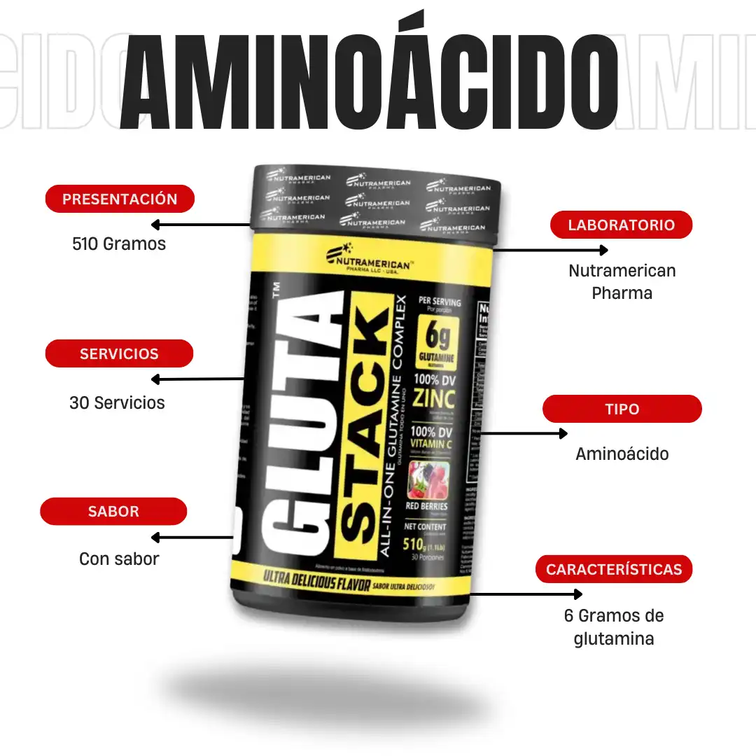 Gluta Stack contiene glutamina, sulfato de zinc y vitamina c, nutrientes especializados en la recuperación muscular. Contiene 30 servicios, la porción son 3 scoops de 17 gramos en 250 ml de agua. Sabor a frutos rojos. Elaborado por Nutramerican Pharma.