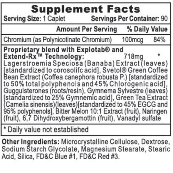 Extracto de Lagerstroemia Speciosa (Banaba) (hojas) [estandarizado al ácido corosólico], extracto de grano de café verde Svetol® (Coffea canephora robusta P.) [estandarizado al 50% de polifenoles totales y 45% de ácido clorogénico], guggulsteronas (raíces/resina), Gymnema Sylvestre (hojas) [estandarizado al 25% de ácido gimnémico], extracto de té verde (Camellia sinensis) (hojas) [estandarizado al 45% de EGCG y 95% de polifenoles], extracto de melón amargo 10:1 (fruta), naringena (fruta), 6,7 dihidroxibergamotina (fruta), sulfato de vanadilo