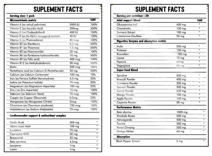 Full pack no solo cubre las deficiencias en vitaminas y minerales que requiere el cuerpo de un deportista, sino que además cuenta con una fórmula de cuidado cardiovascular, protección articular, una matriz para mejorar el rendimiento físico y las enzimas digestivas necesarias para mejorar el fitness. absorción de macronutrientes.