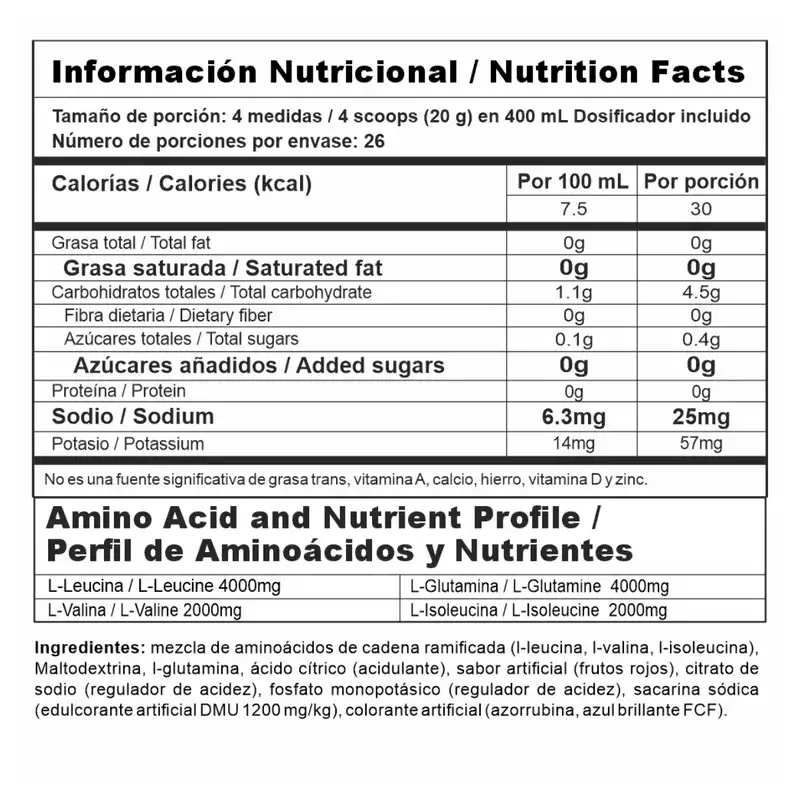 Nitro Shock es un cóctel de aminoácidos ramificados y glutamina, ideal para consumir antes o durante el entrenamiento para el mantenimiento de los músculos, contiene 8 gramos de aminoácidos ramificados y 4 gramos de glutamina. Un servicio son 4 medidas de 20g, contiene 26 servicios por envase. Sabor a frutos rojos. Elaborado por Nutramerican Pharma.