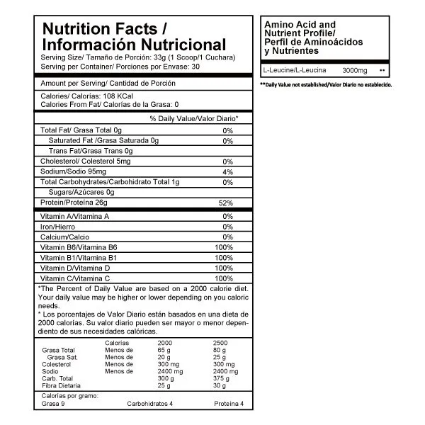 Alimento en polvo a base de proteína aislada de suero con L-LEUCINA, caseína micelar.