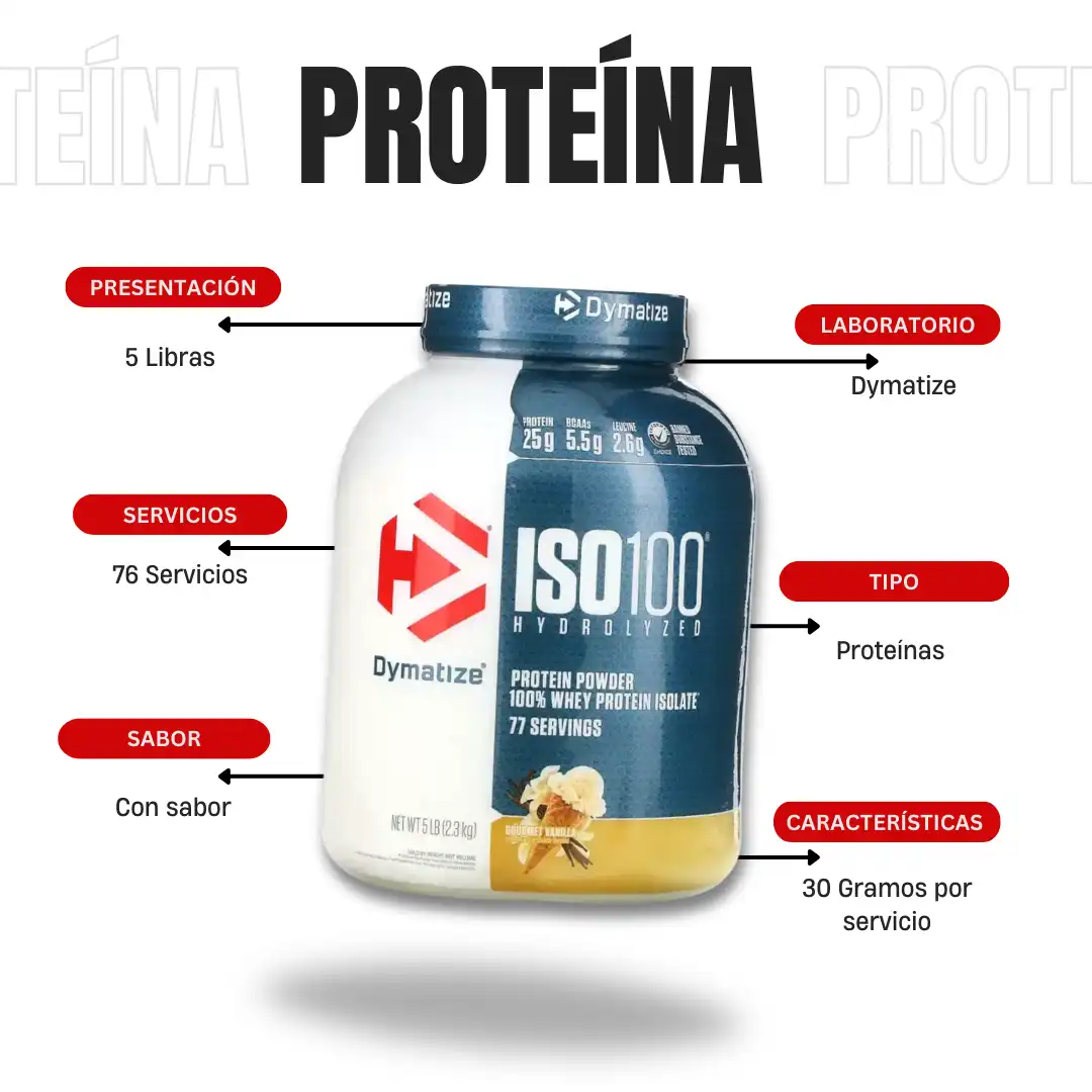 ISO 100 es una proteína hidrolizada de suero aislado de la marca Dymatize. Es un alimento ideal para aquellas personas que desean aumentar masa muscular y obtener una recuperación más efectiva. Es una fuente rica en proteínas y un bajo aporte de carbohidratos, grasa y lactosa.