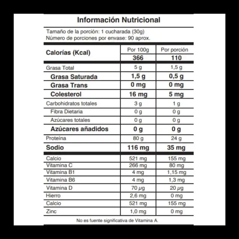 Proteína de suero al 90%, Proteína de suero al 80%, Suero de leche desmineralizado, sabor (saborizante artificial), L leucina (fuente de aminoácido), caseína, goma xantha (espesante), fosfato tricálcico (fuente de calcio), lecitina de soya (emulsificante), dióxido de silicio AA-6P (anticompactante), Carboximetil celulosa CMC (espesante), ácido ascórbico (fuente de vitamina C), sucralosa (edulcorante no calórico), Stevia (edulcorante no calórico), Vitamina B6 (piridoxina) ,Vitamina B1 (tiamina), Vitamina D.