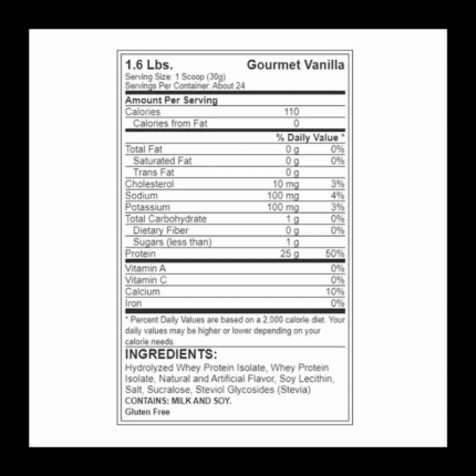 INGREDIENTES: Proteína Concentrada de Suero de Leche, Proteína Concentrada de Leche, Proteína Aislada de Soya, Cocoa (Chocolate), Sabor Idéntico al Natural (Vainilla y Chocolate), Goma Xanthan (Espesante), Carboximetilcelulosa (Estabilizante), Lecitina de Soya (Estabilizante), Dióxido de Silicio (Anticompactante), Sucralosa (Edulcorante), Benzoato de Sodio (Conservante) (1000mg/kg), Vitamina C (Ácido Ascórbico), Lactasa en Polvo, Vitamina B6 (Piridoxina), Vitamina B1 (Tiamina).
