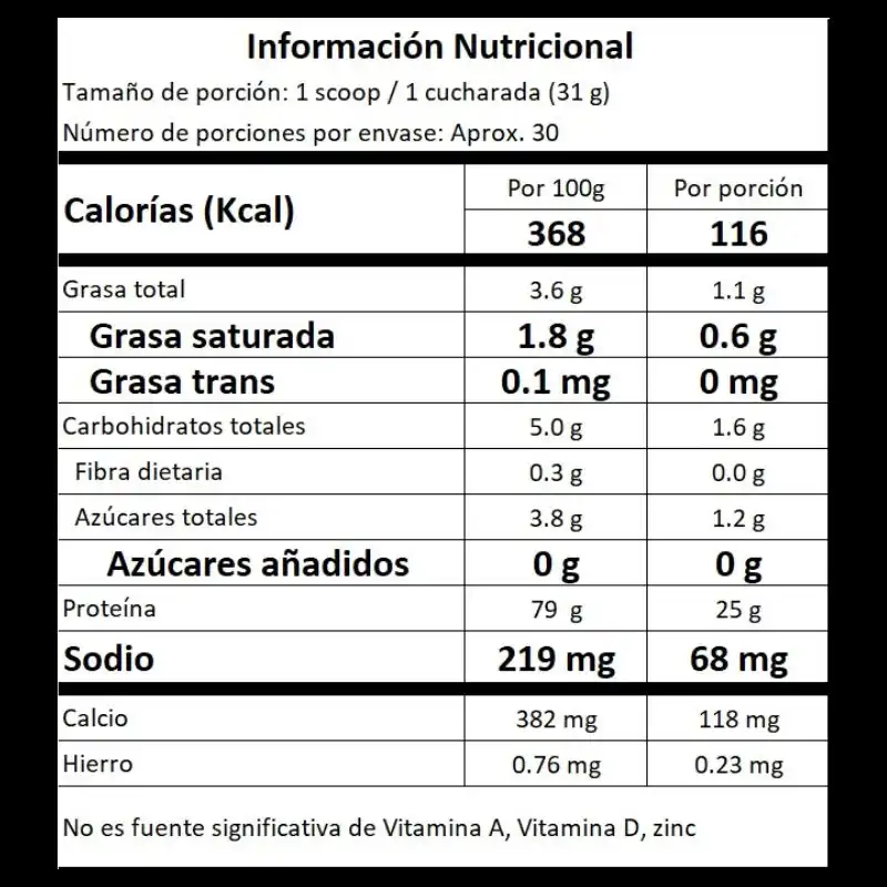 75% proteína concentrada y 25% proteína aislada, sabor summer vainilla, antiespumante, sucralosa y probióticos (lactobacillus coagulans).
