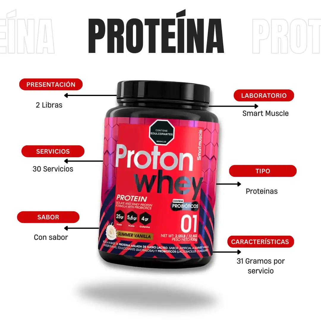 Proton Whey de Smart Muscle es una proteína con probióticos, disponible en 2 y 4 libras. Una fórmula pensada para quienes buscan cuidar su alimentación dentro y fuera del entrenamiento.