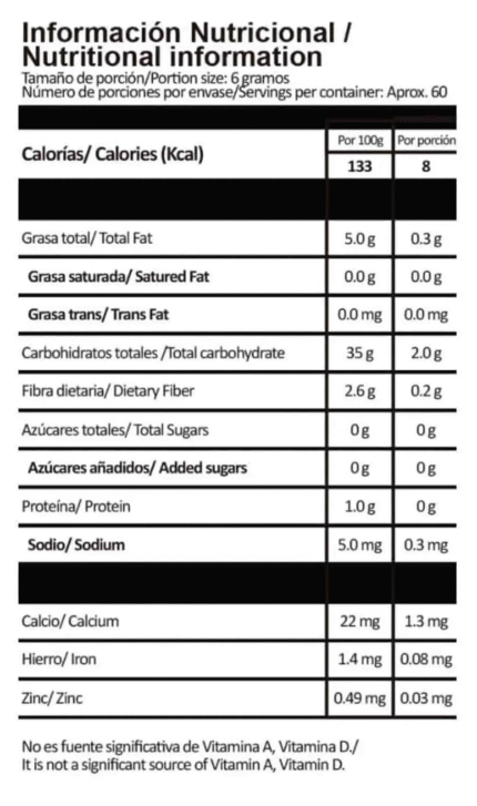 No contiene: Azúcar, almidón, colores artificiales, sabores artificiales, conservantes, sodio, trigo, gluten, maíz, soya, lácteos o levadura.
