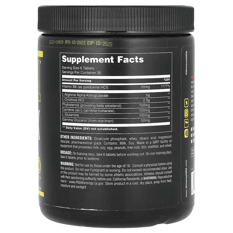 Los días de entrenamiento, tomar 6 comprimidos antes de entrenar. Los días de descanso, tomar 6 comprimidos antes de acostarse.